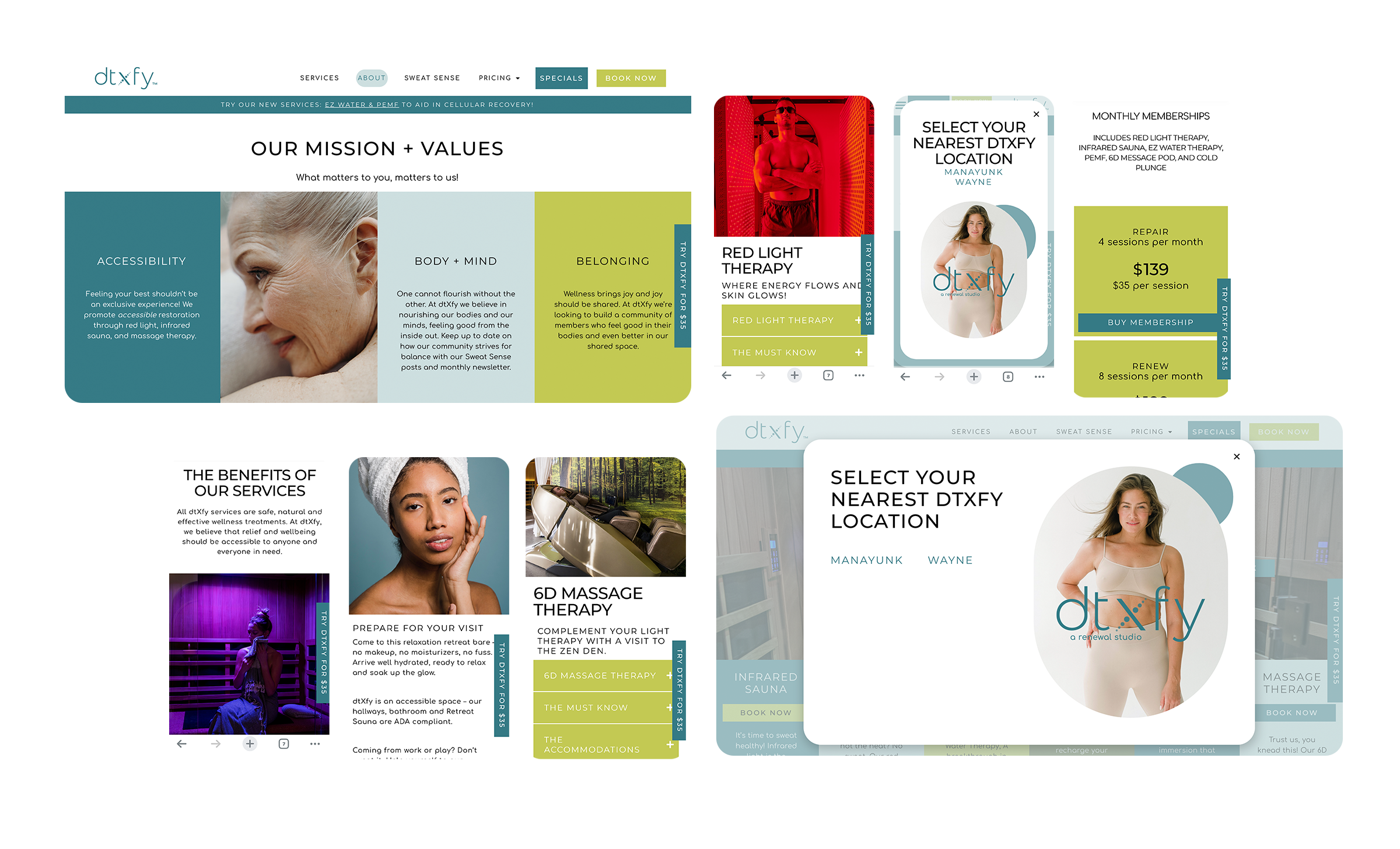 The website had one job. Built with MindBody software integrated throughout the UX, the site was designed to make booking feel as seamless and considered as the in-studio experience itself. dtXfy has since grown to multiple locations across Pennsylvania, with a brand system built to travel with them.