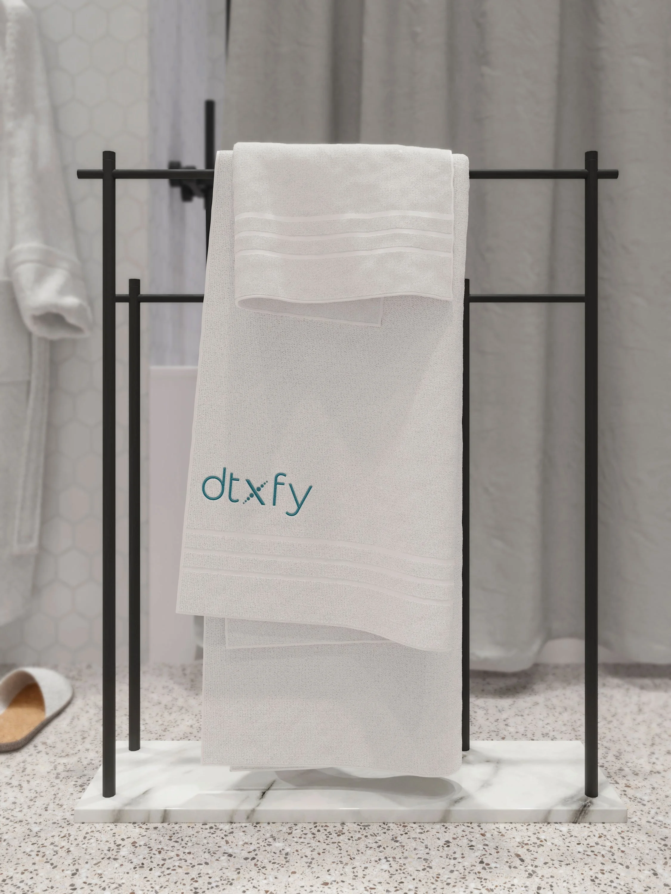 dtXfy knew they wanted to lean on an X as their icon, and so that's where our exploration began. The primary logo places the dtXfy X at its center, leveraging the degree symbol and progressively darkening and then progressively fading. The mark became a visual metaphor for the experience itself — you arrive worn down, you leave renewed. That idea, built directly into the mark, became the foundation for a full brand system.